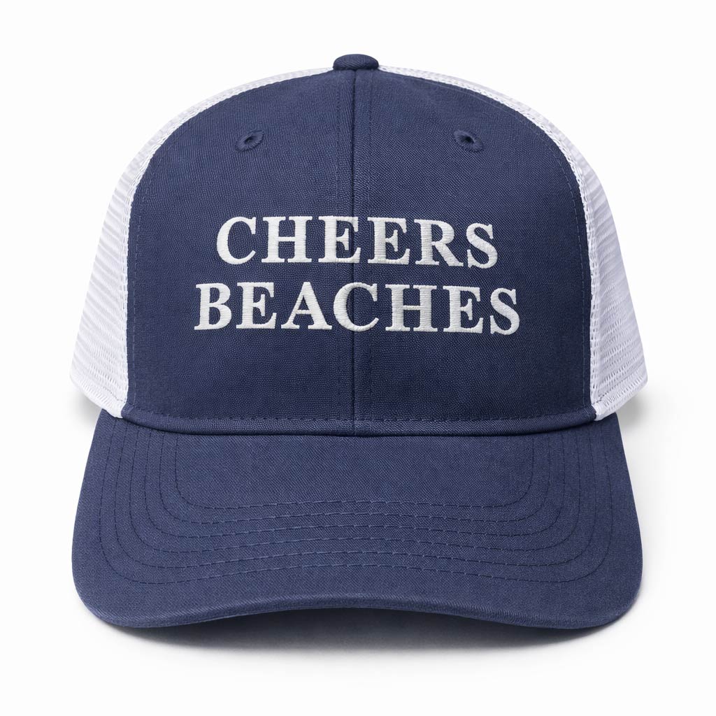 Cheers Beaches Embroidered Ponytail Trucker Hat: Navy Blue & White